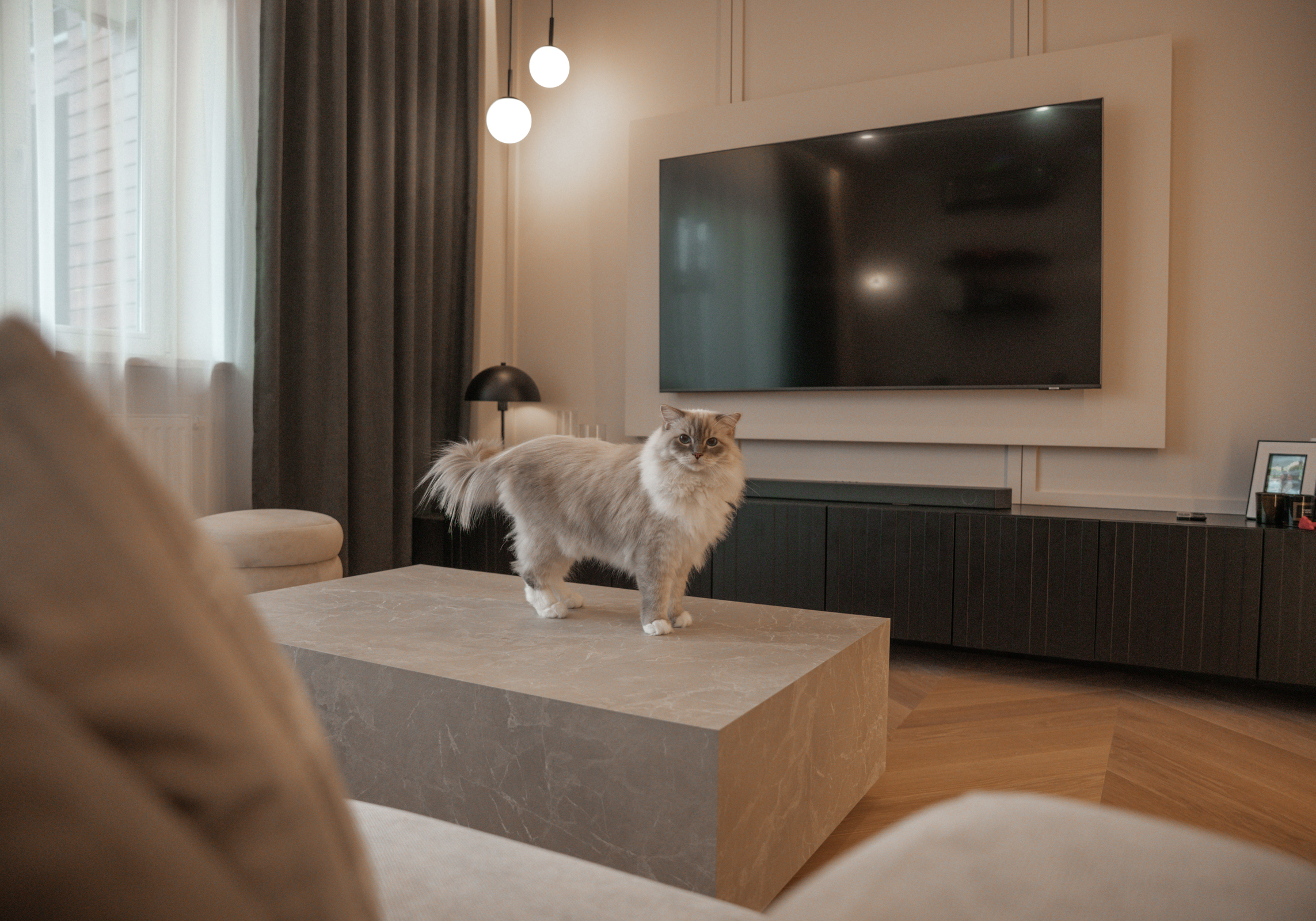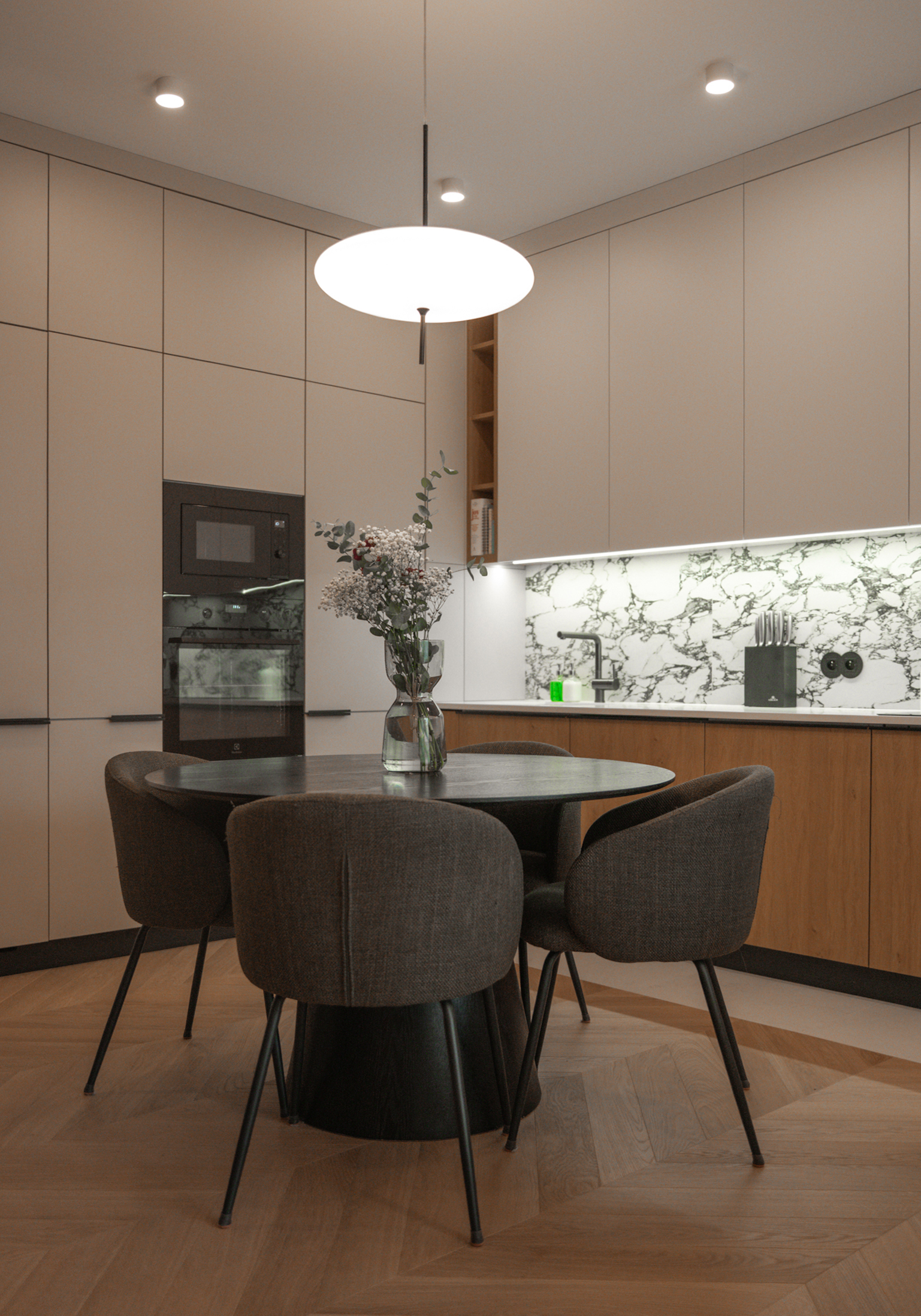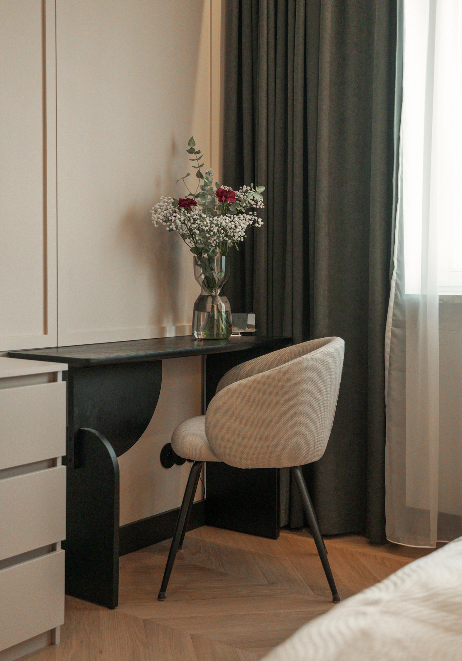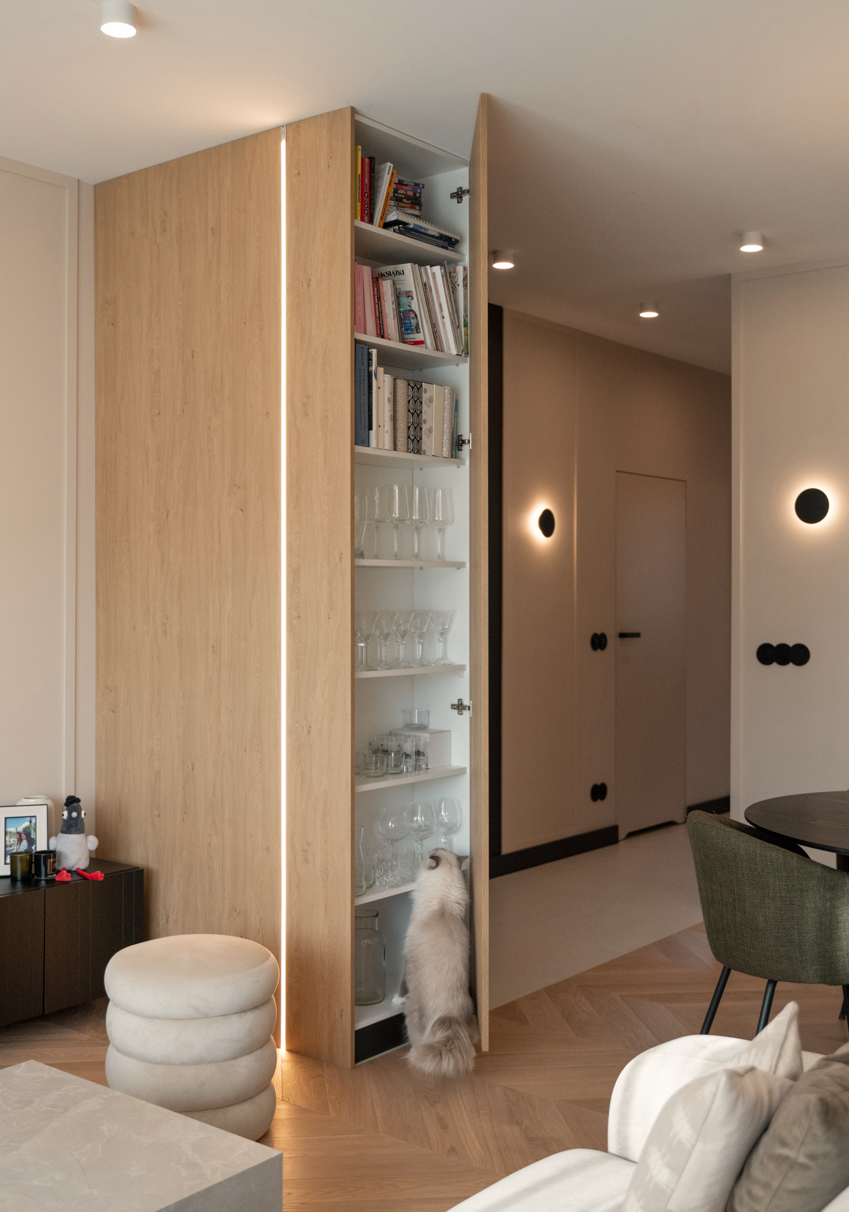 Mieszkanie przeszło gruntowną metamorfozę obejmującą między innymi wyburzenia, zmianę układu ścian działowych i instalacji. Dzięki przeprowadzonym zabiegom udało się uzyskać dobrze doświetloną, otwartą przestrzeń będącą sercem mieszkania, w której salon z kuchnią i jadalnią tworzą harmonijną całość. Zastosowana w projekcie drewniana podłoga ociepla wnętrze i nadaje mu elegancji, a wysokiej jakości płytki włoskiego producenta stanowią tło dla codziennego życia, nie dominując lecz podkreślając charakter wnętrza. Choć paleta kolorystyczna opiera się głównie na beżu i czerni projekt zyskuje na oryginalności dzięki odważnym akcentom takim jak welurowe zasłony w kolorze butelkowej zieleni, tapicerowane krzesła w tym samym kolorze, biżuteryjne uchwyty meblowe oraz pojawiający się w części dziennej oraz łazience wzór marmuru Calacatta Viola. W projekcie przewidziano również rozwiązania przyjazne kotom - dyskretne przejścia, tkaniny odporne na pazury oraz ukryte miejsca do odpoczynku - tak aby kot czuł się we wnętrzu tak komfortowo jak jego właściciele.