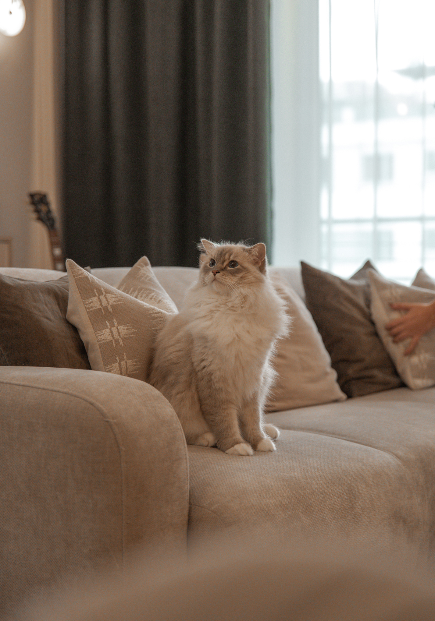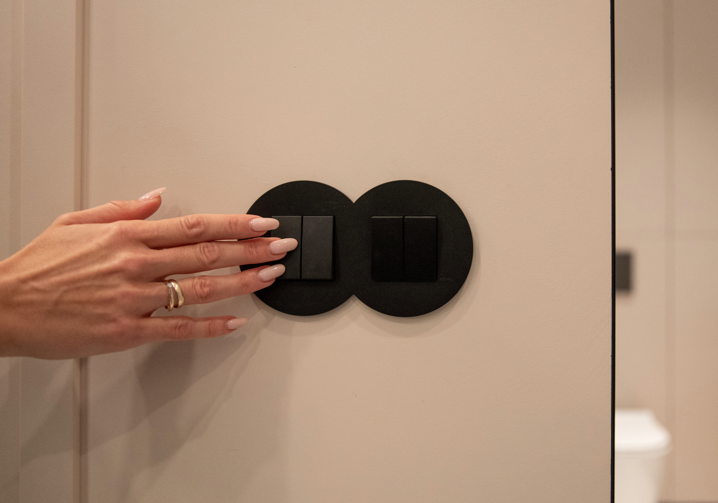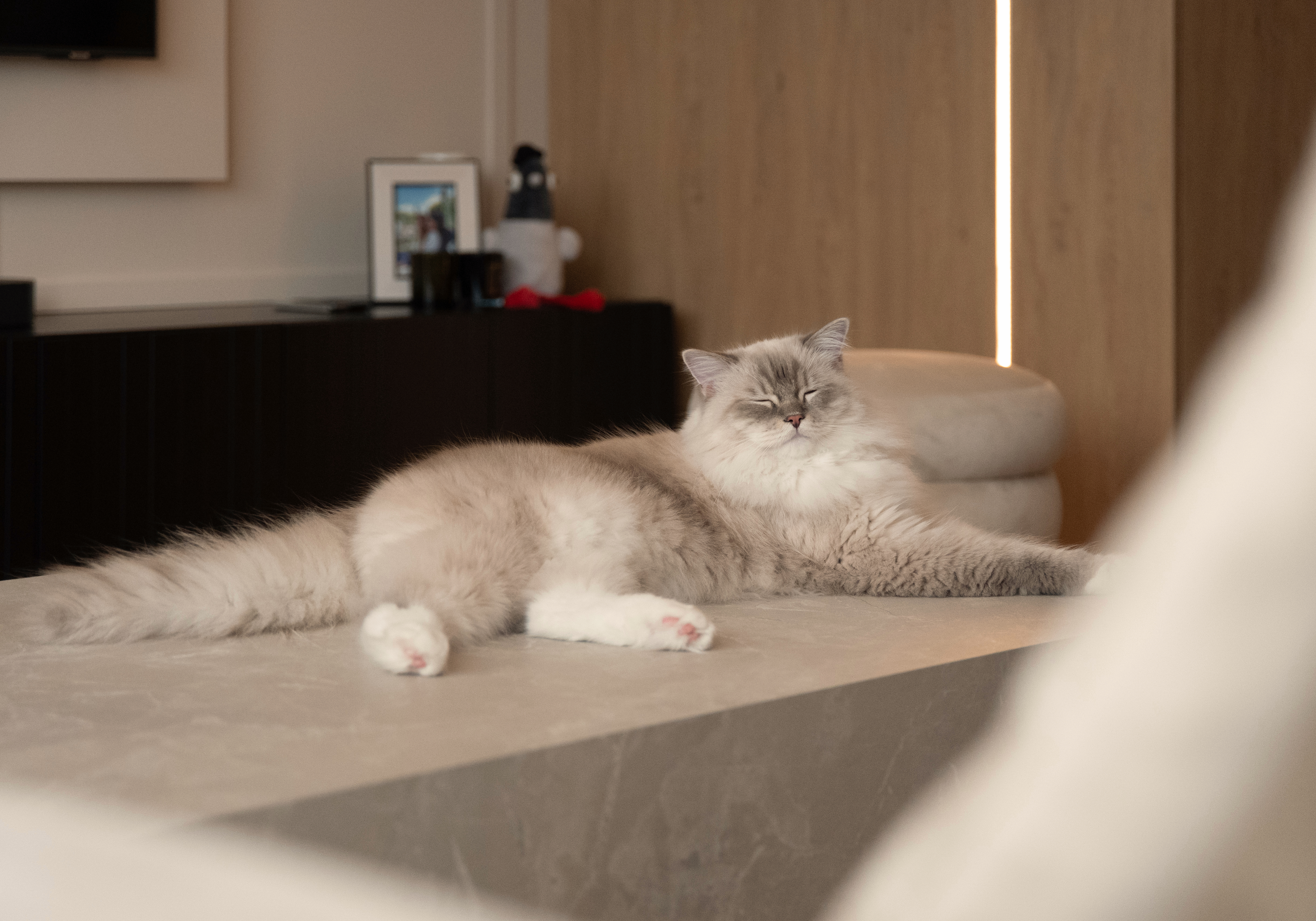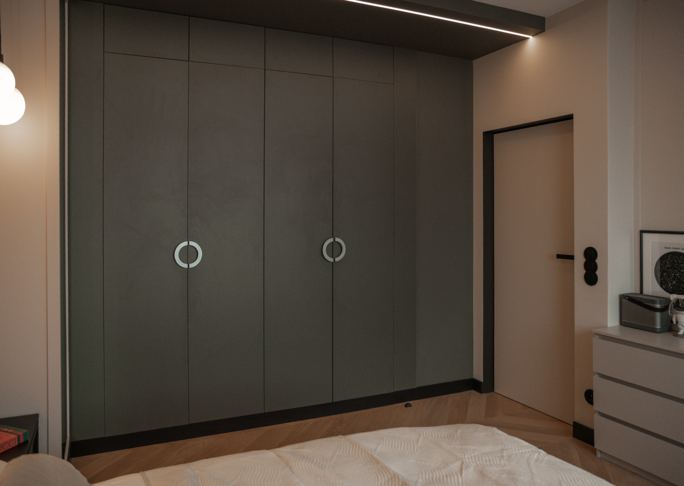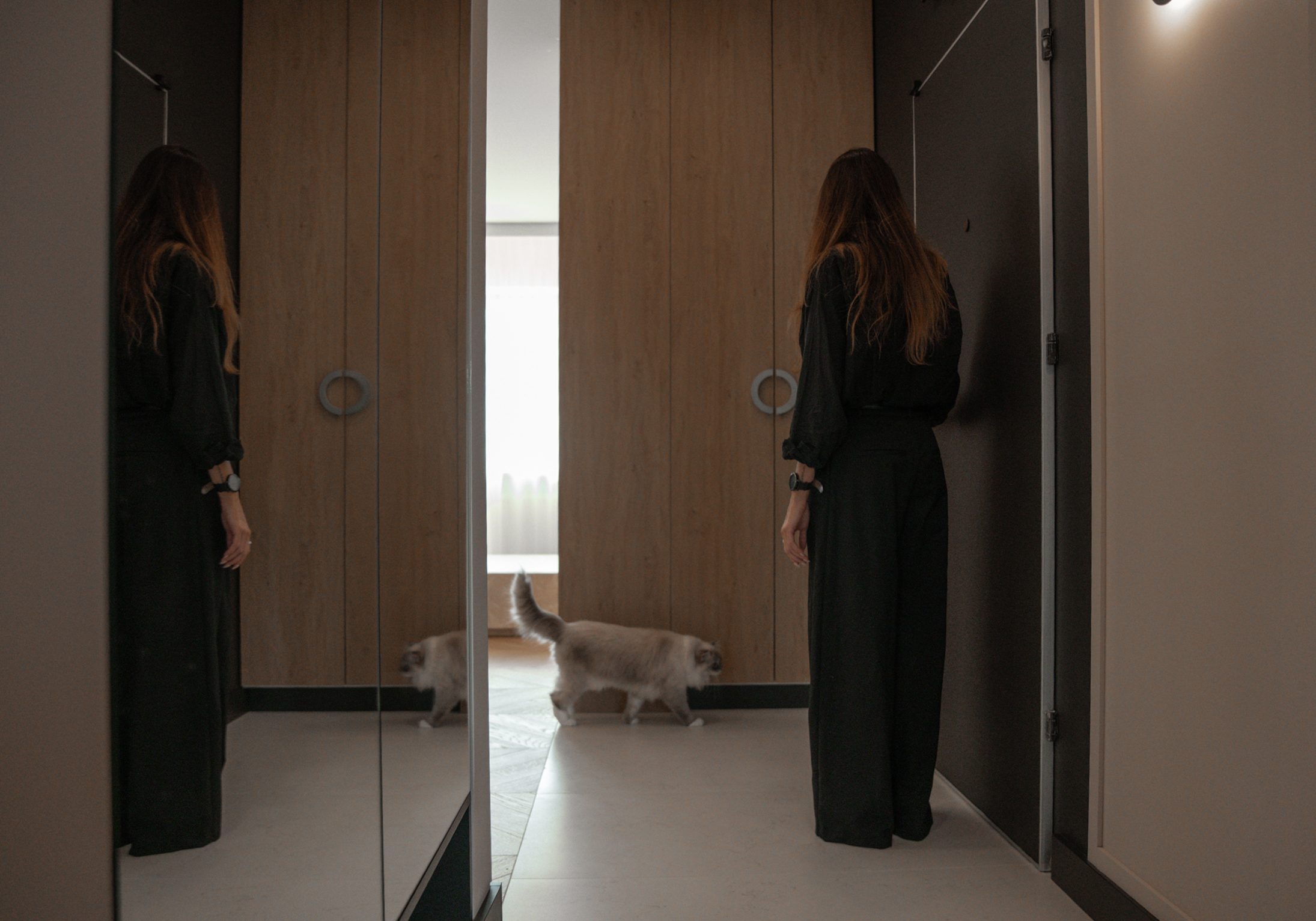 Mieszkanie przeszło gruntowną metamorfozę obejmującą między innymi wyburzenia, zmianę układu ścian działowych i instalacji. Dzięki przeprowadzonym zabiegom udało się uzyskać dobrze doświetloną, otwartą przestrzeń będącą sercem mieszkania, w której salon z kuchnią i jadalnią tworzą harmonijną całość. Zastosowana w projekcie drewniana podłoga ociepla wnętrze i nadaje mu elegancji, a wysokiej jakości płytki włoskiego producenta stanowią tło dla codziennego życia, nie dominując lecz podkreślając charakter wnętrza. Choć paleta kolorystyczna opiera się głównie na beżu i czerni projekt zyskuje na oryginalności dzięki odważnym akcentom takim jak welurowe zasłony w kolorze butelkowej zieleni, tapicerowane krzesła w tym samym kolorze, biżuteryjne uchwyty meblowe oraz pojawiający się w części dziennej oraz łazience wzór marmuru Calacatta Viola. W projekcie przewidziano również rozwiązania przyjazne kotom - dyskretne przejścia, tkaniny odporne na pazury oraz ukryte miejsca do odpoczynku - tak aby kot czuł się we wnętrzu tak komfortowo jak jego właściciele.