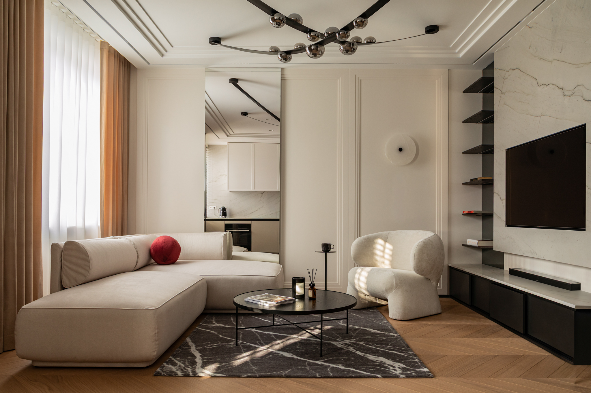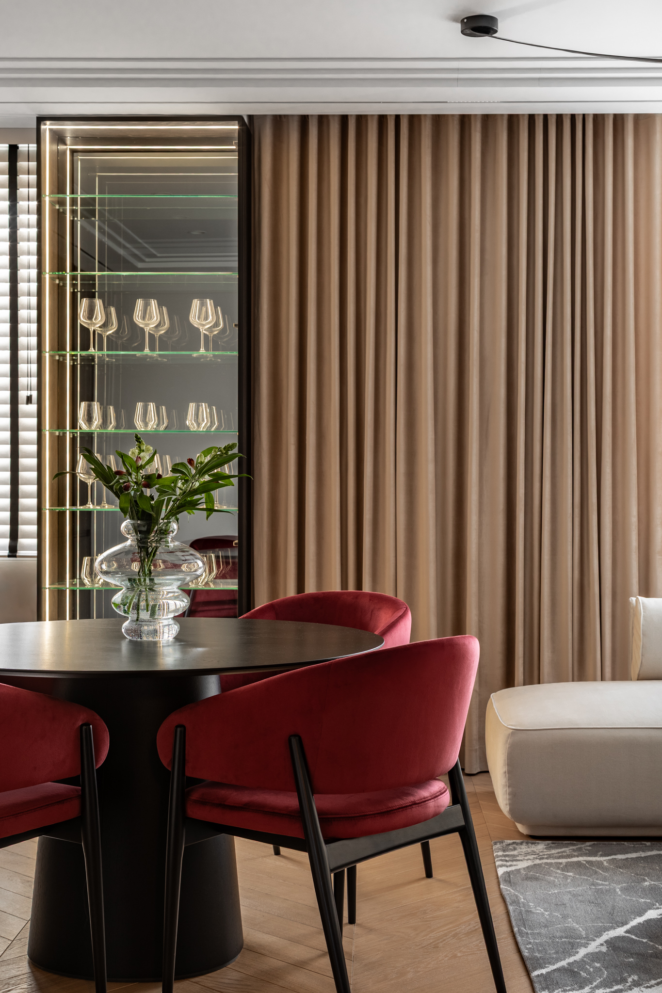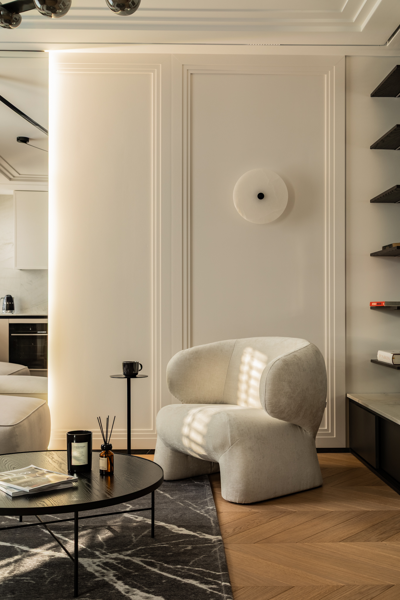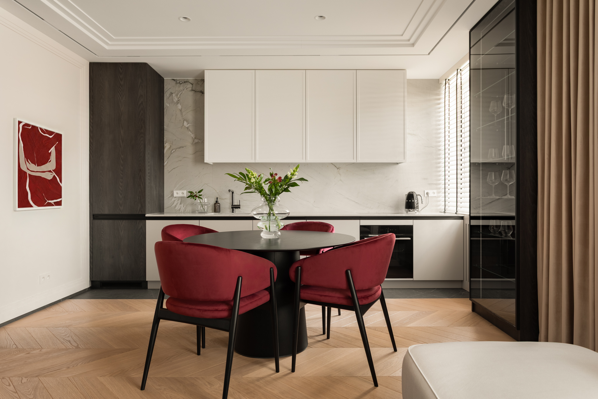 Mieszkanie o powierzchni 49m² znajduje się w zabytkowej kamienicy na warszawskim Starym Żoliborzu. Głównym założeniem projektowym było zachowanie subtelnego dialogu pomiędzy przeszłością, a teraźniejszością. Wnętrze mimo współczesnego charakteru zachowuje klimat zabytkowej kamienicy za sprawą sztukaterii zdobiących ściany i sufity. Przeprowadzony w mieszkaniu gruntowny remont obejmujący między innymi zmianę układu ścian działowych i instalacji pozwolił przeorganizować przestrzeń wydobywając tym samym w pełni potencjał mieszkania. Zastosowane w projekcie naturalne materiały takie jak kamień i drewno wprowadzają do wnętrza autentyczność. Stonowana paleta barw obejmująca biele, beże, brązy i czernie buduje we wnętrzu harmonijną i ponadczasową elegancję. Minimalistyczna kreacja mieszkania została przełamana bordowymi akcentami, które nadają wnętrzu wyrazistego charakteru.