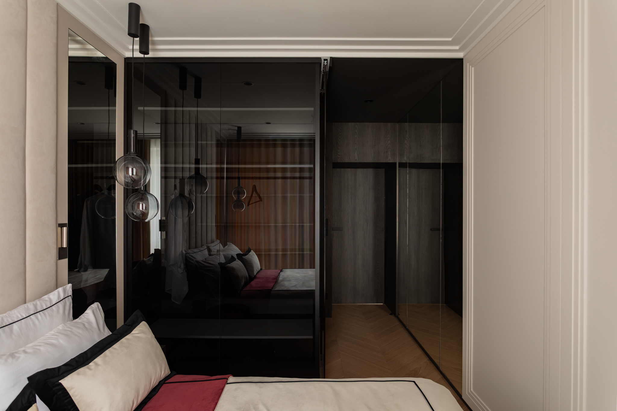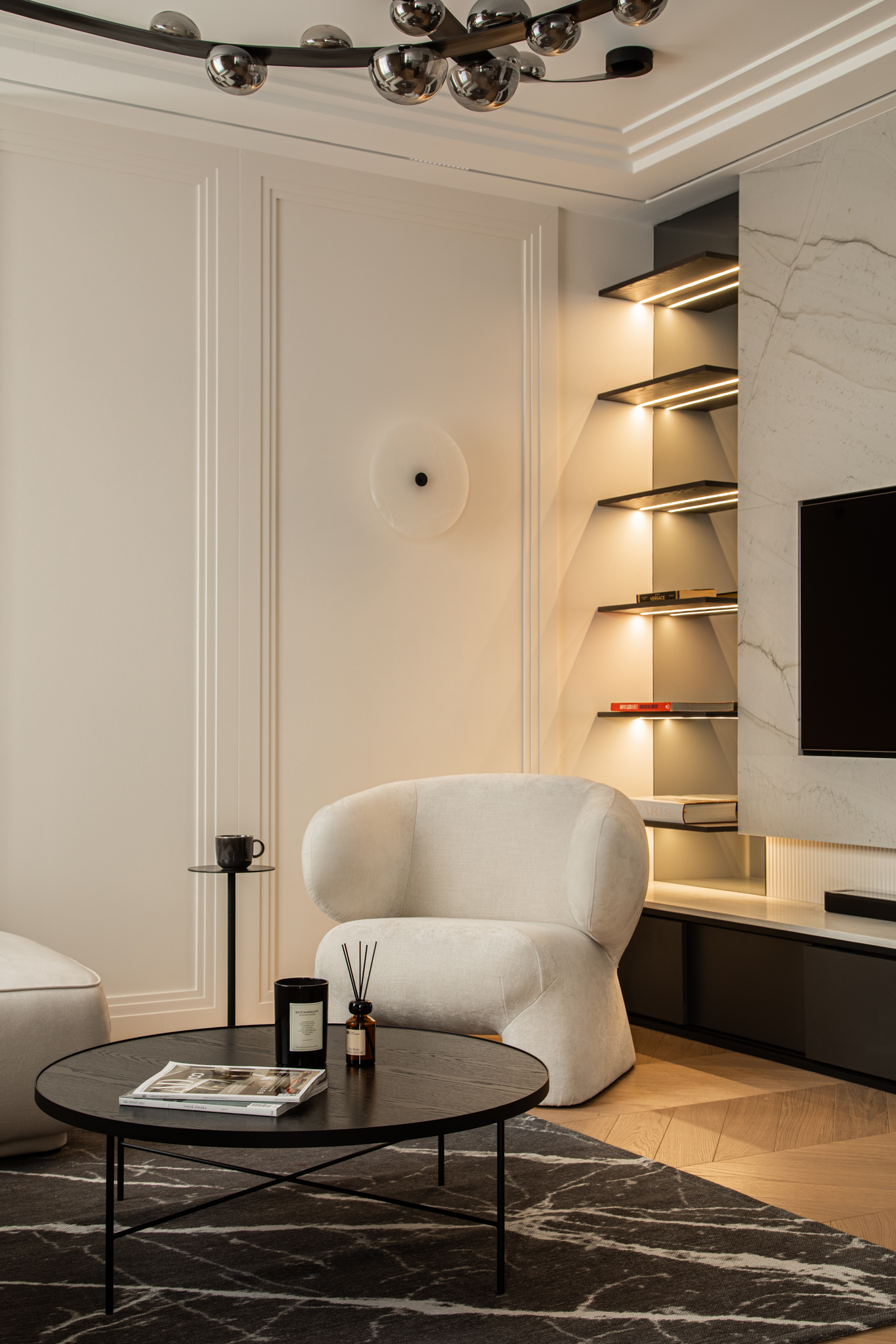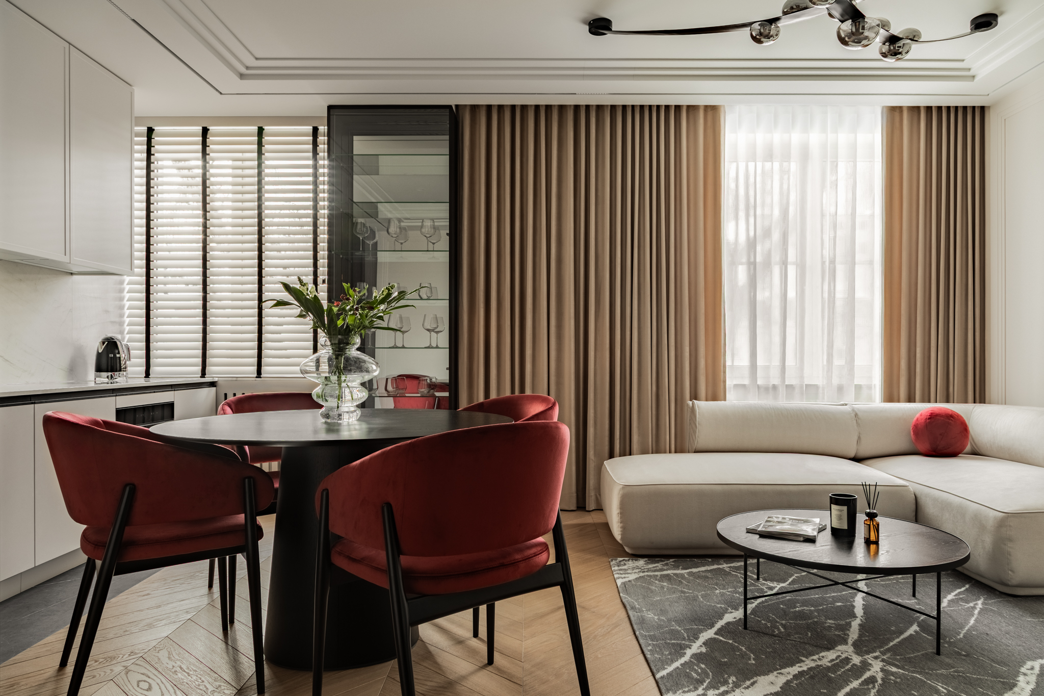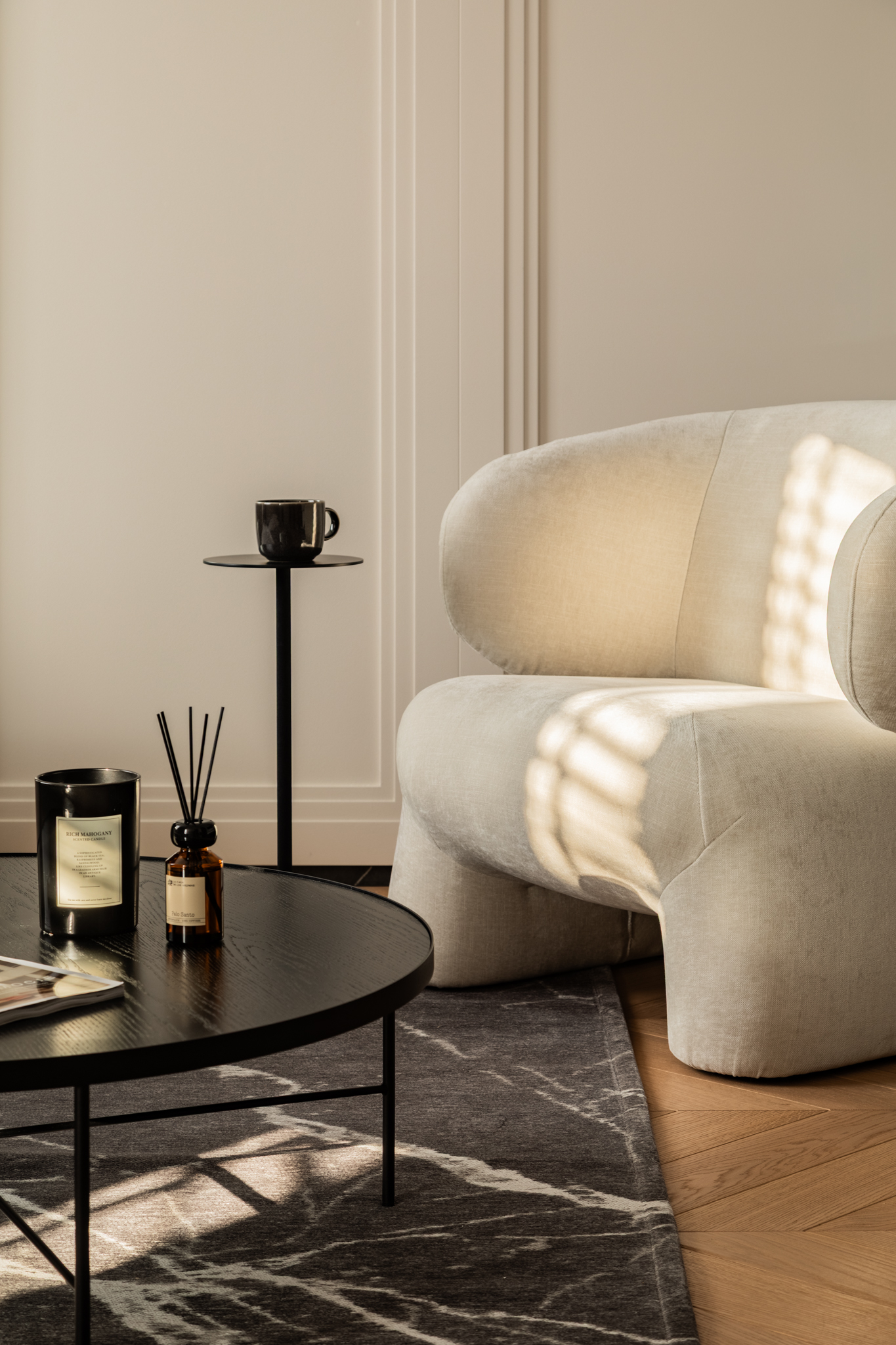 Mieszkanie o powierzchni 49m² znajduje się w zabytkowej kamienicy na warszawskim Starym Żoliborzu. Głównym założeniem projektowym było zachowanie subtelnego dialogu pomiędzy przeszłością, a teraźniejszością. Wnętrze mimo współczesnego charakteru zachowuje klimat zabytkowej kamienicy za sprawą sztukaterii zdobiących ściany i sufity. Przeprowadzony w mieszkaniu gruntowny remont obejmujący między innymi zmianę układu ścian działowych i instalacji pozwolił przeorganizować przestrzeń wydobywając tym samym w pełni potencjał mieszkania. Zastosowane w projekcie naturalne materiały takie jak kamień i drewno wprowadzają do wnętrza autentyczność. Stonowana paleta barw obejmująca biele, beże, brązy i czernie buduje we wnętrzu harmonijną i ponadczasową elegancję. Minimalistyczna kreacja mieszkania została przełamana bordowymi akcentami, które nadają wnętrzu wyrazistego charakteru.