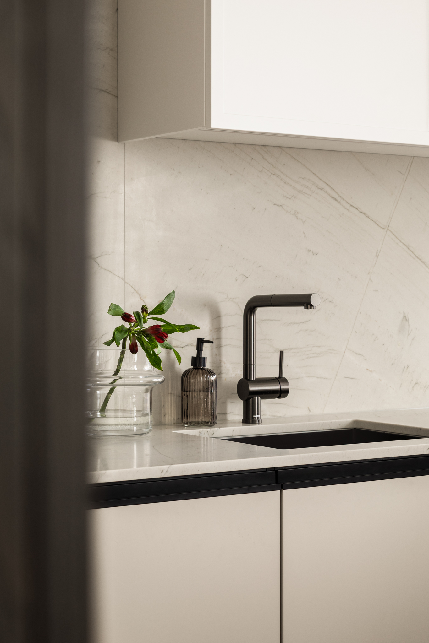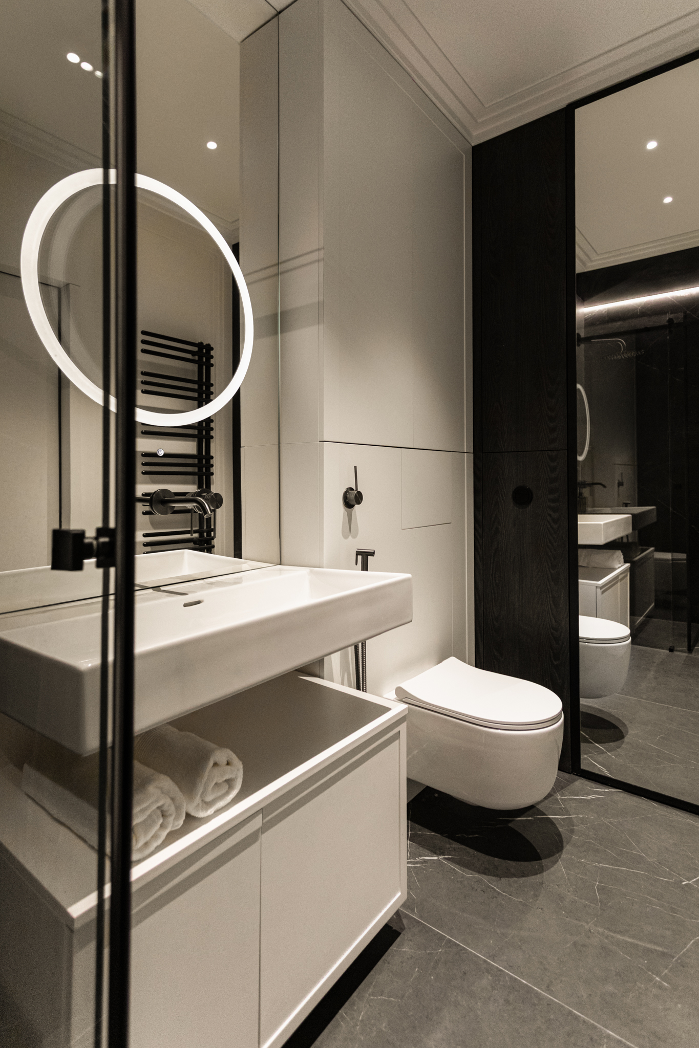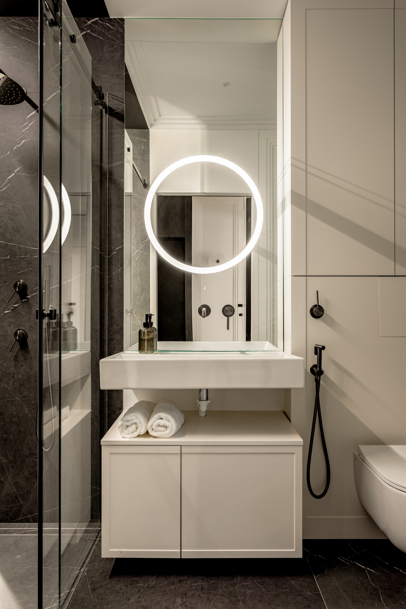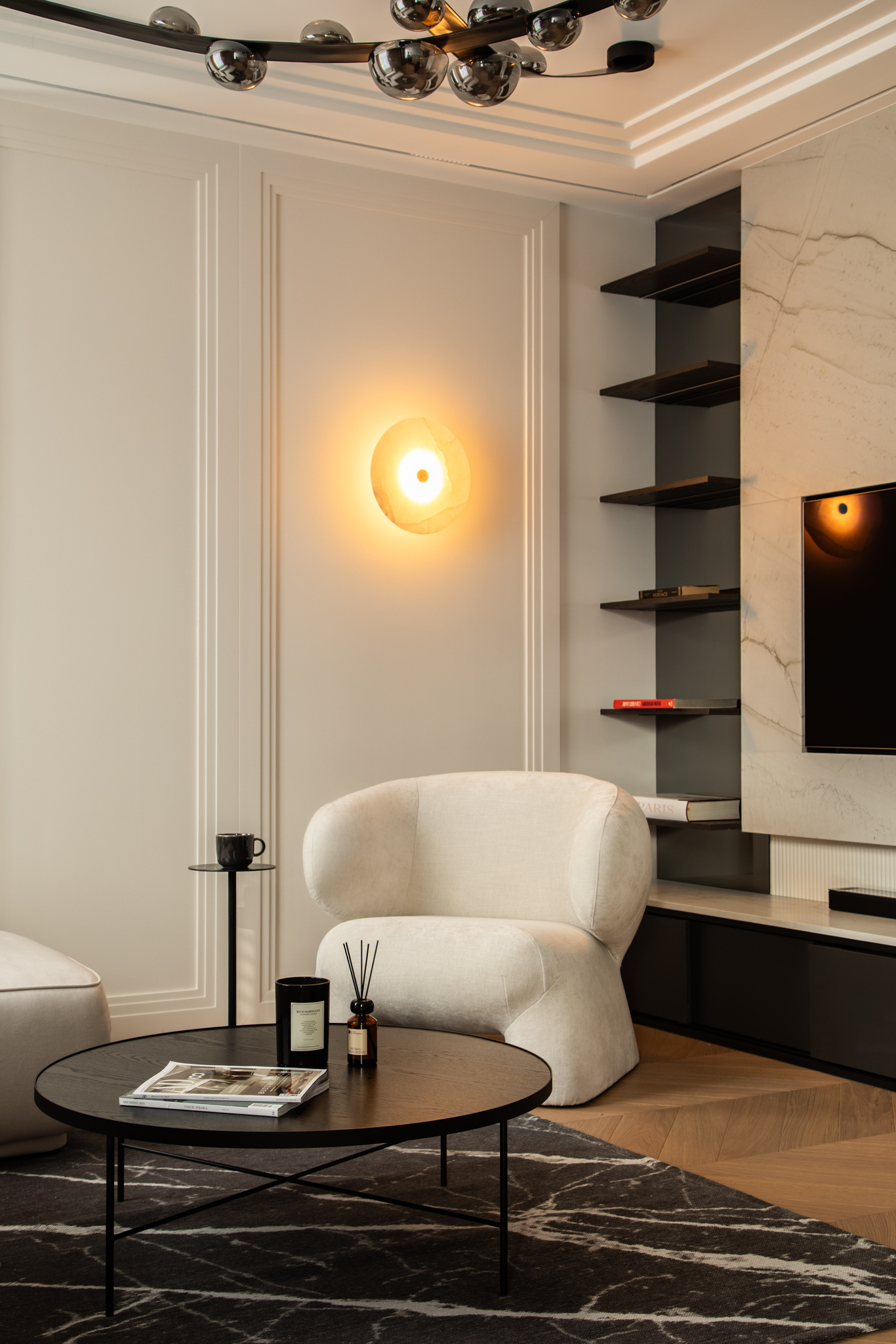 Mieszkanie o powierzchni 49m² znajduje się w zabytkowej kamienicy na warszawskim Starym Żoliborzu. Głównym założeniem projektowym było zachowanie subtelnego dialogu pomiędzy przeszłością, a teraźniejszością. Wnętrze mimo współczesnego charakteru zachowuje klimat zabytkowej kamienicy za sprawą sztukaterii zdobiących ściany i sufity. Przeprowadzony w mieszkaniu gruntowny remont obejmujący między innymi zmianę układu ścian działowych i instalacji pozwolił przeorganizować przestrzeń wydobywając tym samym w pełni potencjał mieszkania. Zastosowane w projekcie naturalne materiały takie jak kamień i drewno wprowadzają do wnętrza autentyczność. Stonowana paleta barw obejmująca biele, beże, brązy i czernie buduje we wnętrzu harmonijną i ponadczasową elegancję. Minimalistyczna kreacja mieszkania została przełamana bordowymi akcentami, które nadają wnętrzu wyrazistego charakteru.